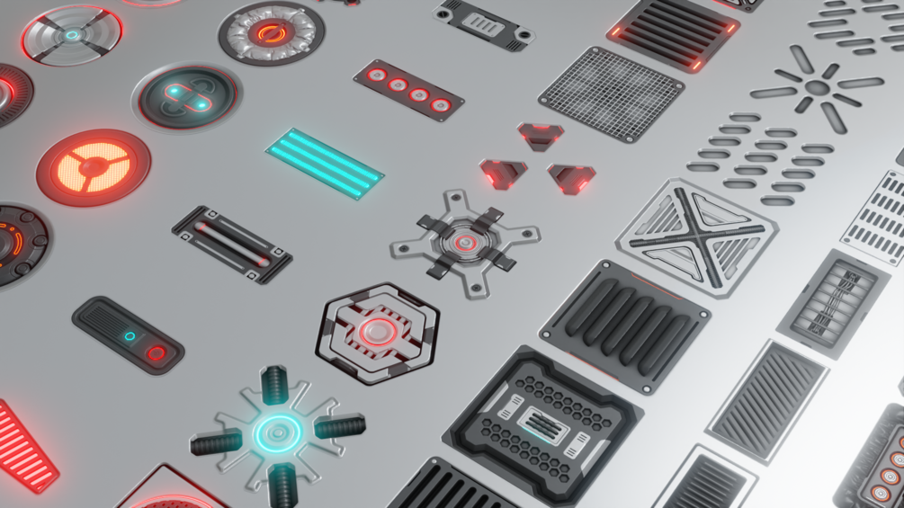 56 Sci-Fi Detailing Decals (40 Emissive and 16 Subsets).